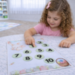 Um recurso para trabalhar a sequenciação numérica de 1 a 10 de forma bem interativa. Com a nossa prancha plastificada e peças com velcro, (material físico) a criança ajuda o coelhinho a organizar os números enquanto desenvolve: