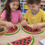 Com esse recurso pedagógico da melancia, os alunos praticam contagem e associação número-quantidade de forma divertida e visual. As crianças colocam as “sementes” na melancia conforme o número indicado, tornando o aprendizado muito mais envolvente.