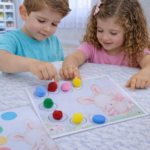 Com este material plastificado (recurso físico), as crianças utilizam pompons (ou outros objetos coloridos) para identificar e reproduzir as cores nos ovinhos. É um exercício incrível para: