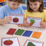 Com esse recurso pedagógico, os alunos observam as figuras e descobrem qual é a cor de cada alimento, desenvolvendo a atenção, a linguagem e o reconhecimento das cores.