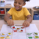 Com esse recurso pedagógico, a criança classifica os alimentos por cores de forma lúdica, desenvolvendo percepção visual, atenção e organização.