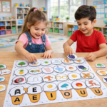 Utilizamos esse recurso lúdico onde cada aluno precisa identificar e associar as imagens às suas vogais correspondentes.